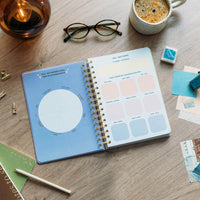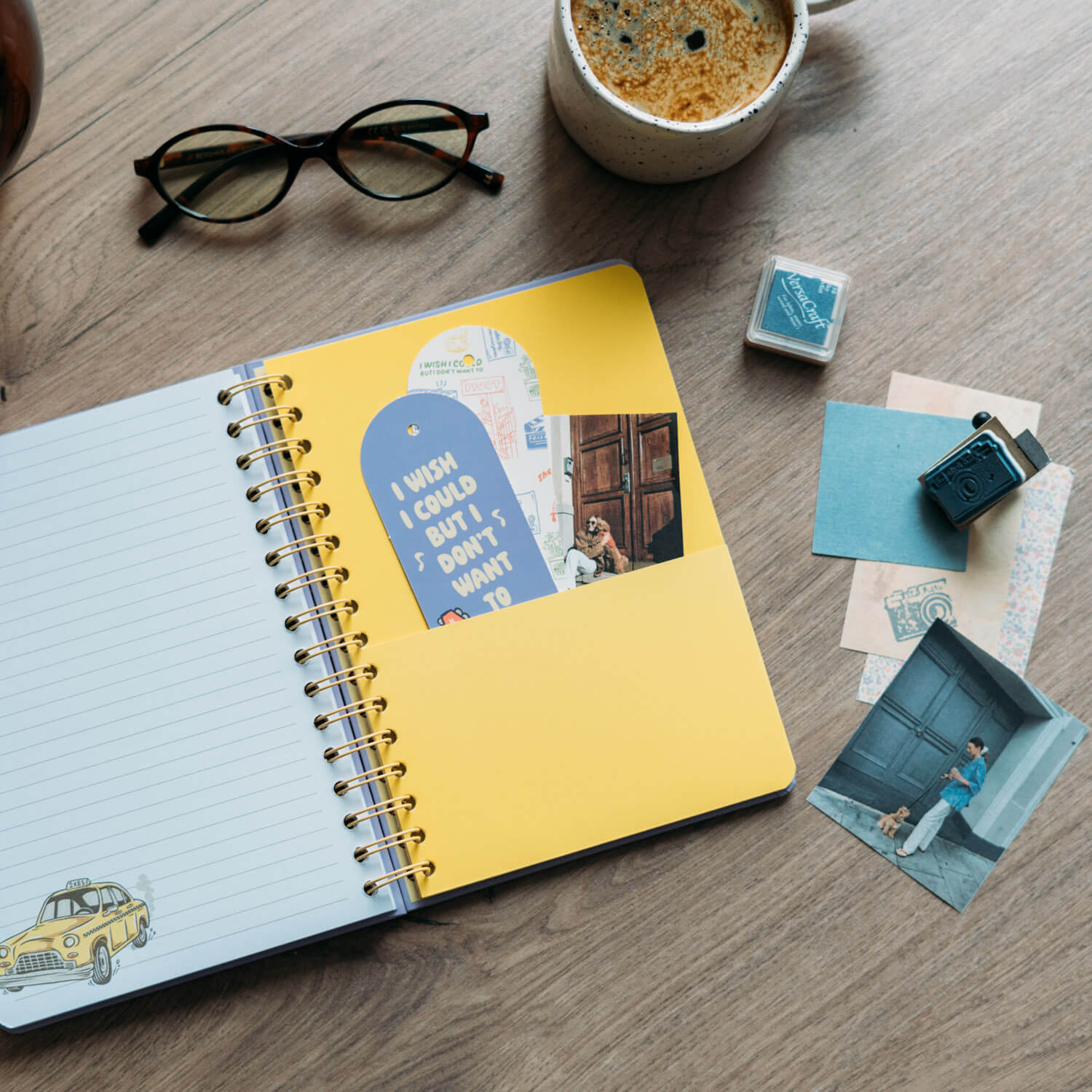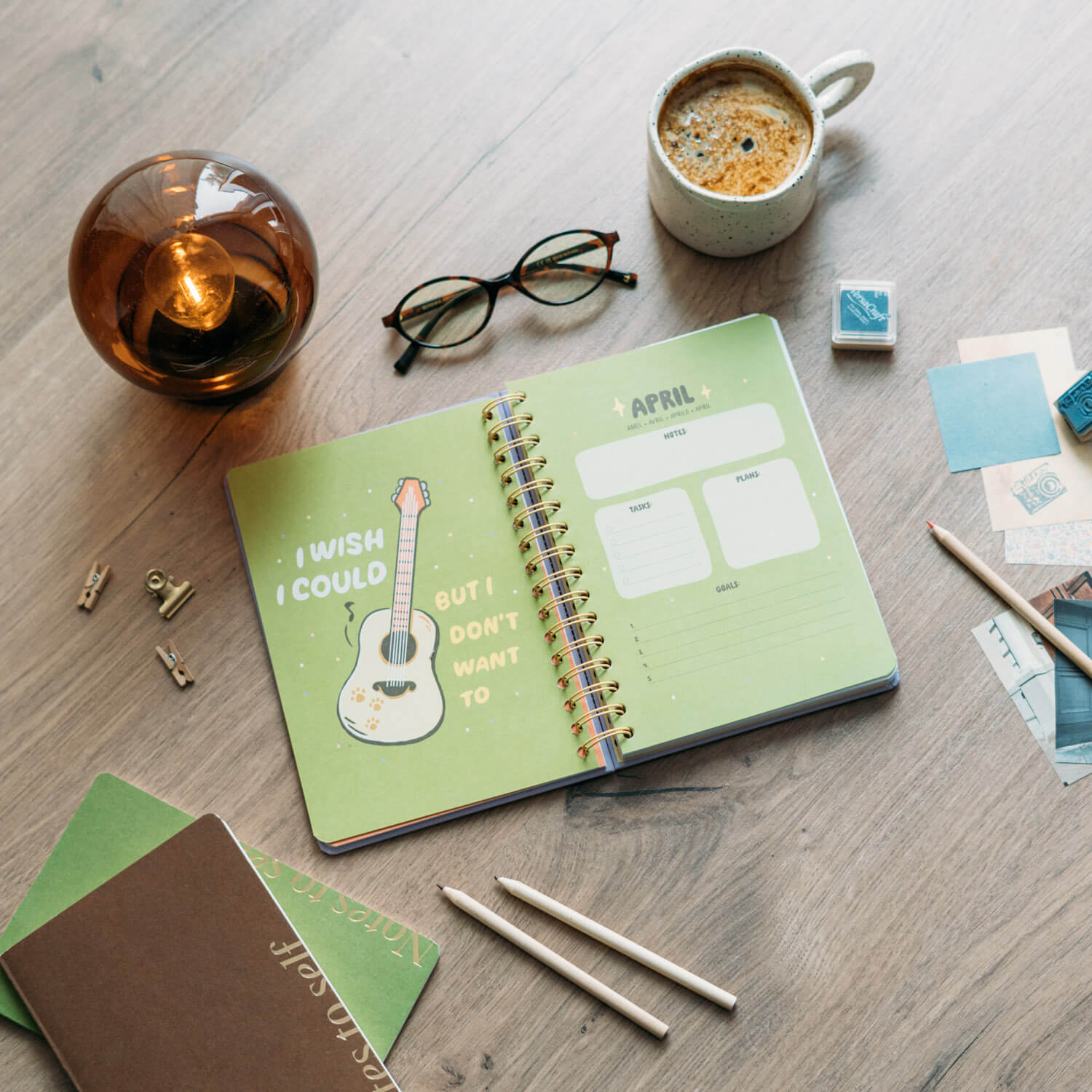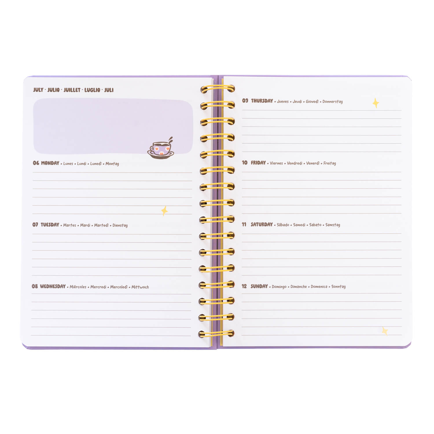 Contiene 176 páginas de 100 g/m2 con diseño interior personalizado y un bolsillo en la parte trasera. Incluye 2 páginas de pegatinas y 2 marcapáginas troquelados. Idiomas incluidos: español, inglés, francés, italiano y alemán.