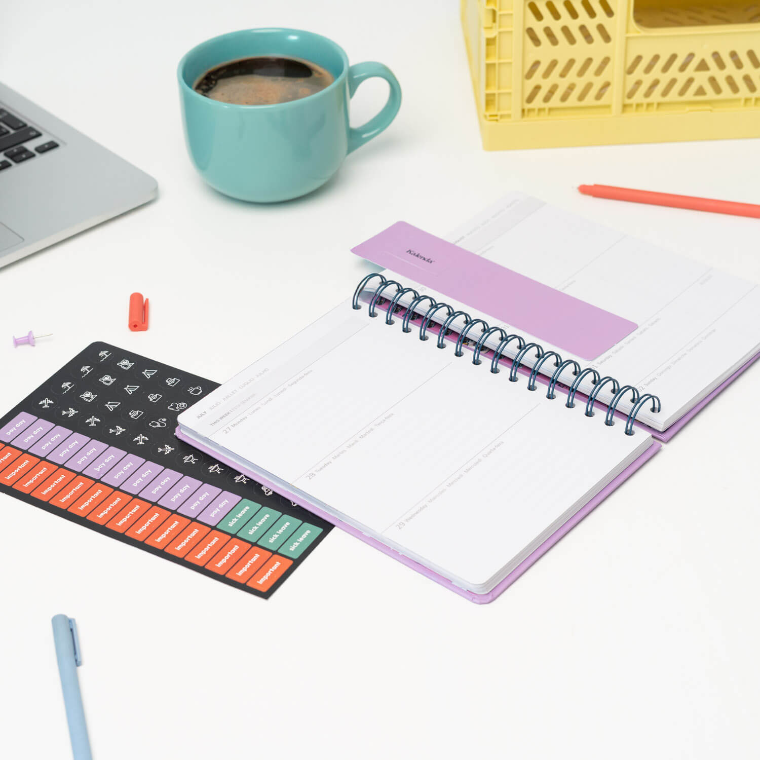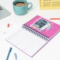 Contiene 176 páginas de 100 g/m2 con diseño interior genérico e incluye una página de pegatinas genéricas, 2 marcapáginas troquelados y varias láminas separadoras personalizadas.
