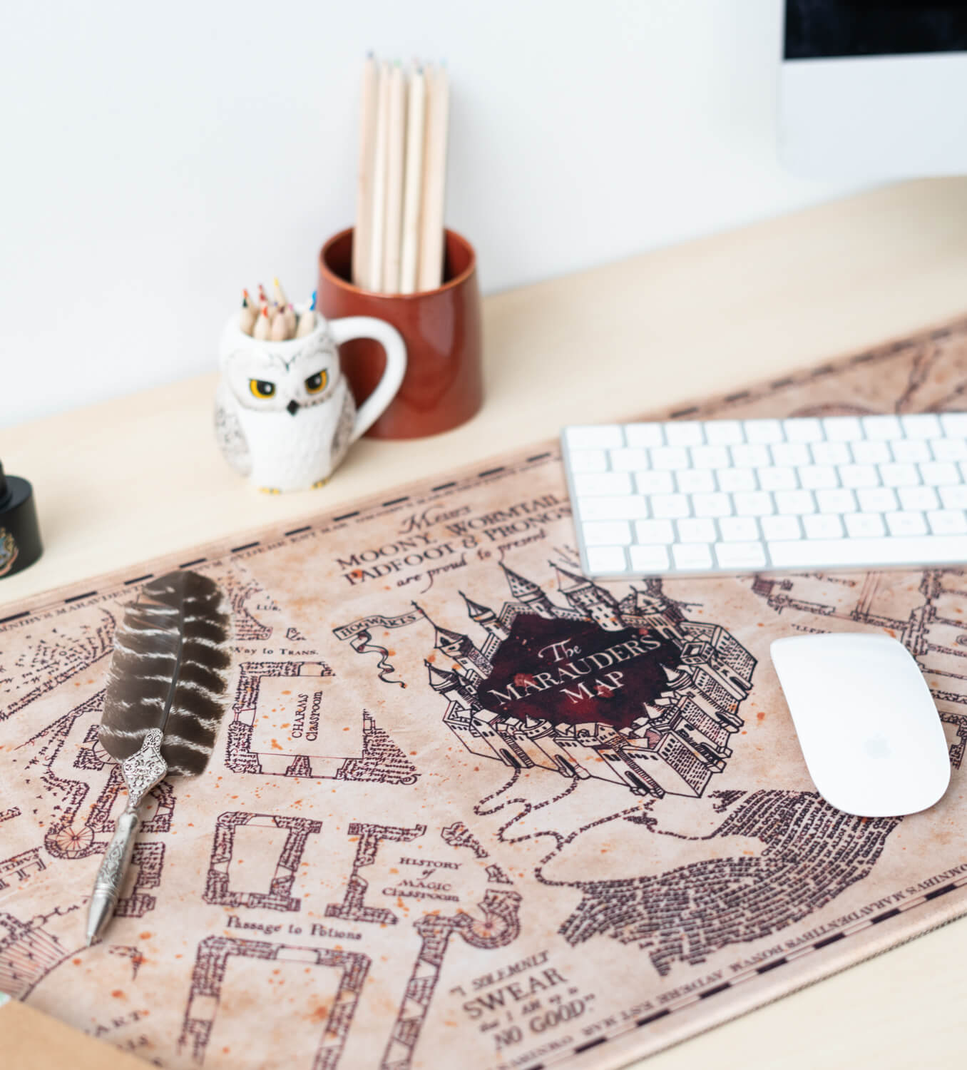 Este mousepad de Harry Potter, con diseño inspirado en el Mapa del Merodeador, es el complemento ideal para darle a tu escritorio o setup gaming un toque único y original. Su tamaño XL de 80 centímetros de ancho por 35 de alto te aporta un espacio amplio que permite la colocación tanto del teclado como del ratón.