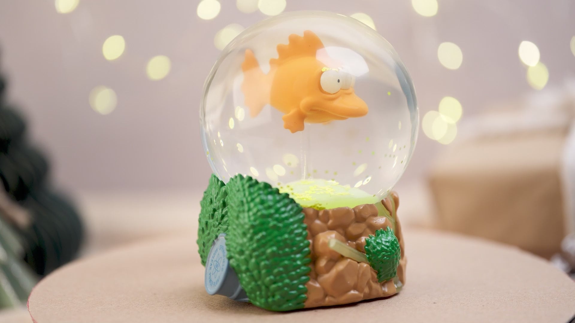 Esta bola de nieve de Los Simpson muestra al icónico pez anaranjado de tres ojos llamado Blinky que aparece en algunos capítulos de la serie. Está fabricada en resina de gran calidad con la esfera hecha de cristal.