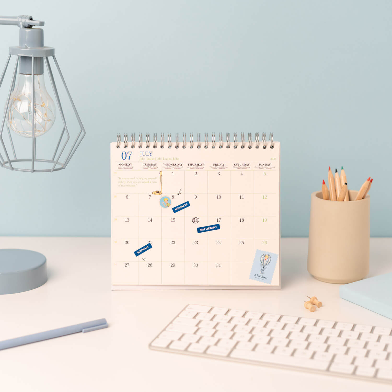 Este calendario de escritorio de El Principito tiene una duración total de 12 meses que abarcan desde Enero hasta Diciembre de 2026. Cuenta con dos formatos de calendario mensual e incluye una imagen diferente para cada mes del año. Idiomas: inglés, español, francés, alemán, italiano y portugués.