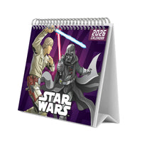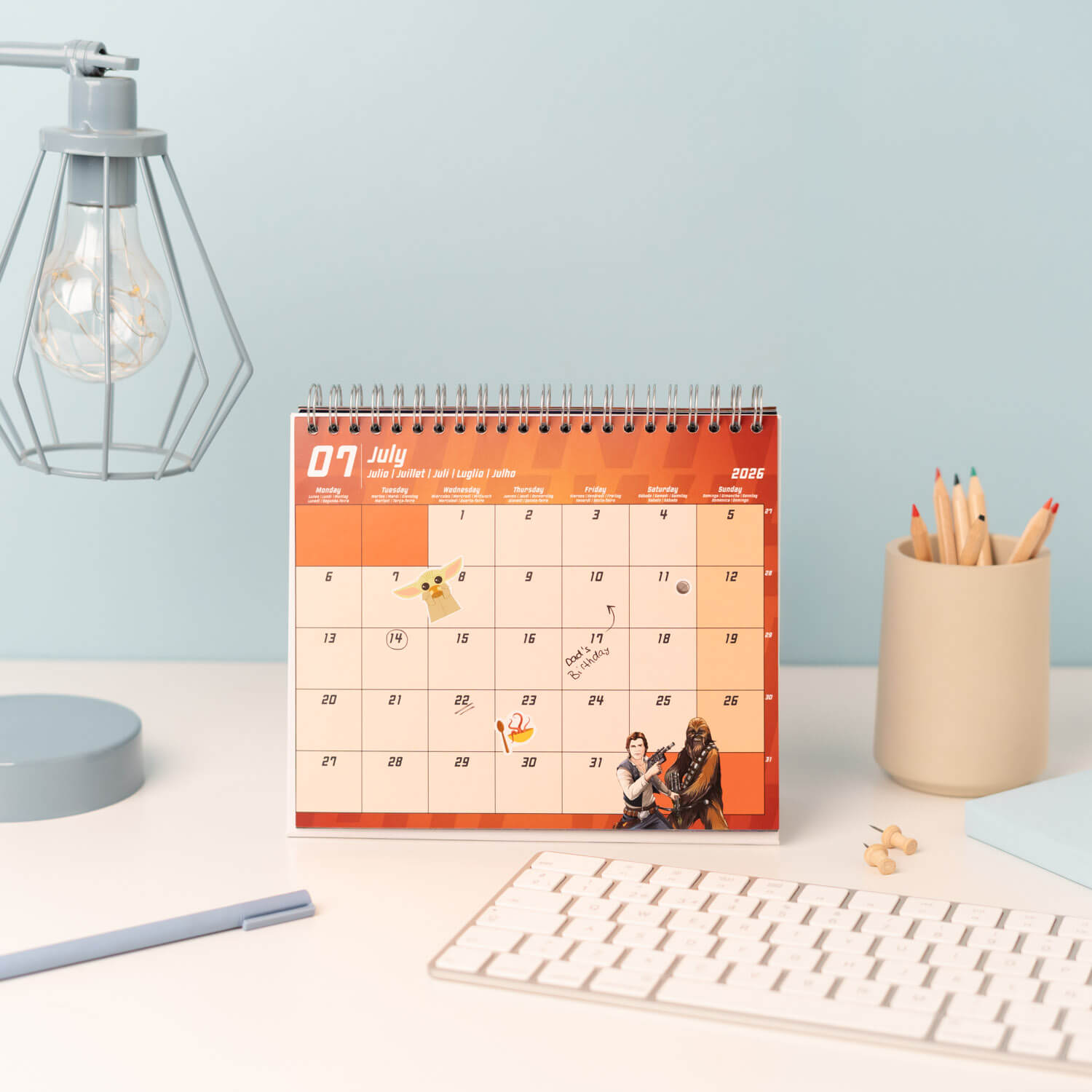 Este calendario de escritorio de Star Wars tiene una duración total de 12 meses que abarcan desde Enero hasta Diciembre de 2026. Cuenta con dos formatos de calendario mensual e incluye una imagen diferente para cada mes del año. Idiomas: inglés, español, francés, alemán, italiano y portugués.