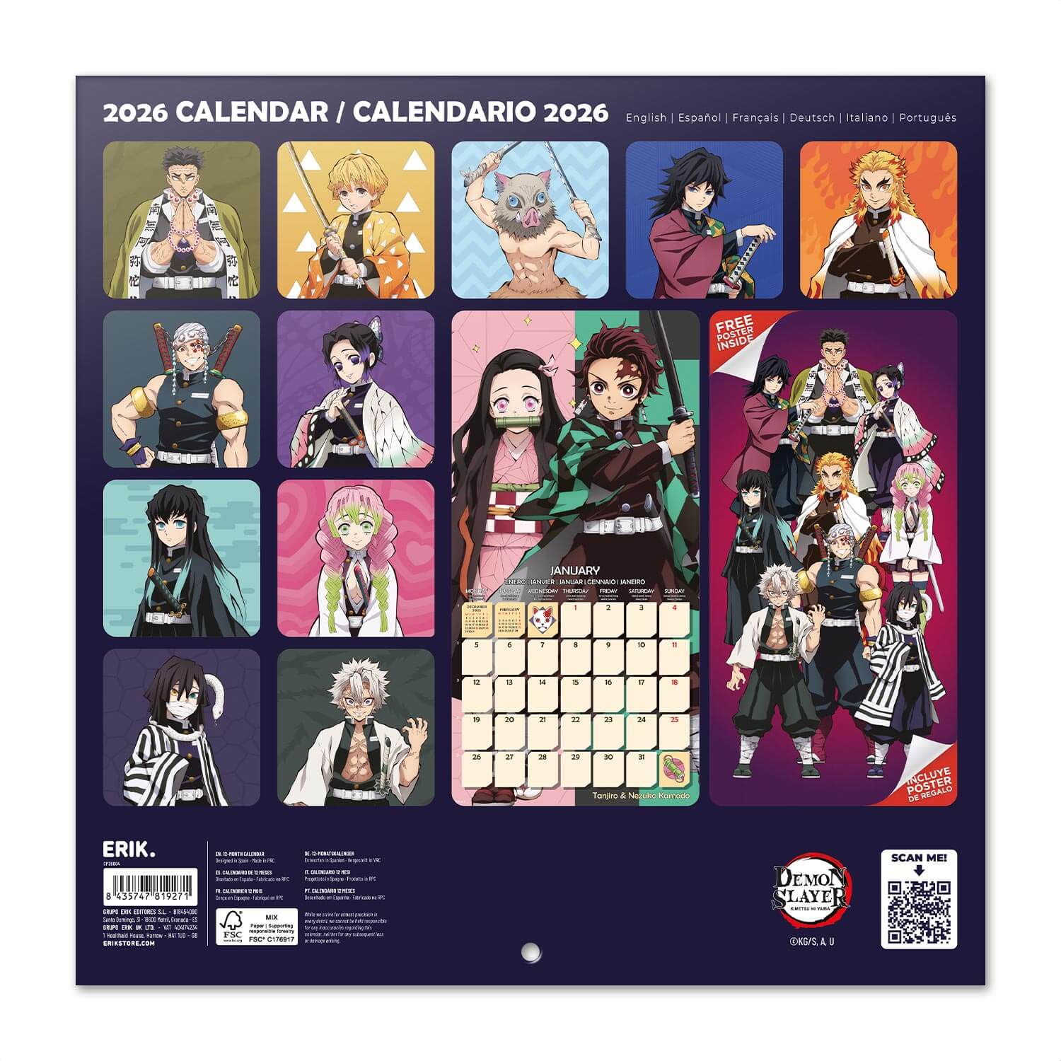 Este calendario de pared de Demon Slayer tiene una duración total de 12 meses que abarcan desde Enero hasta Diciembre de 2026. Contiene 12 ilustraciones y un póster de la serie de anime en su interior. Respecto a su tamaño, mide 30 x 30 cm cuando está cerrado y 30 x 60 cuando está abierto. Incluye los siguientes idiomas: inglés, español, francés, alemán, italiano y portugués.