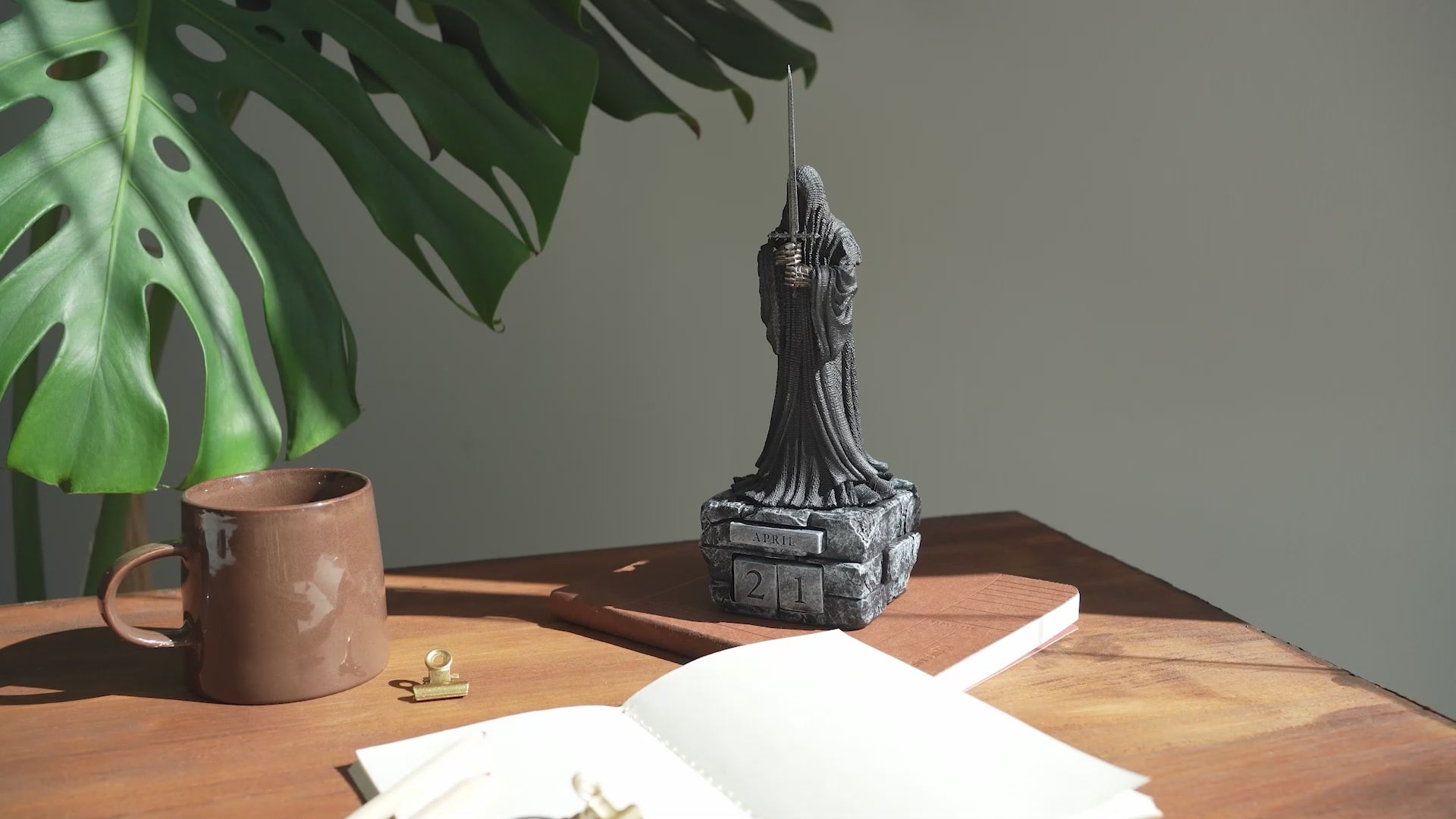 Este calendario perpetuo 3D de El Señor de los Anillos cuenta con un diseño 3D inspirado en un Nazgûl. Cuenta con 5 bloques con números y meses combinables que se pueden intercambiar para configurar todas las fechas posibles del año. Ha sido fabricado en resina y pintado a mano a todo color. Respecto a su tamaño, mide aproximadamente 23 cm de altura y 8,5 cm de diámetro.
