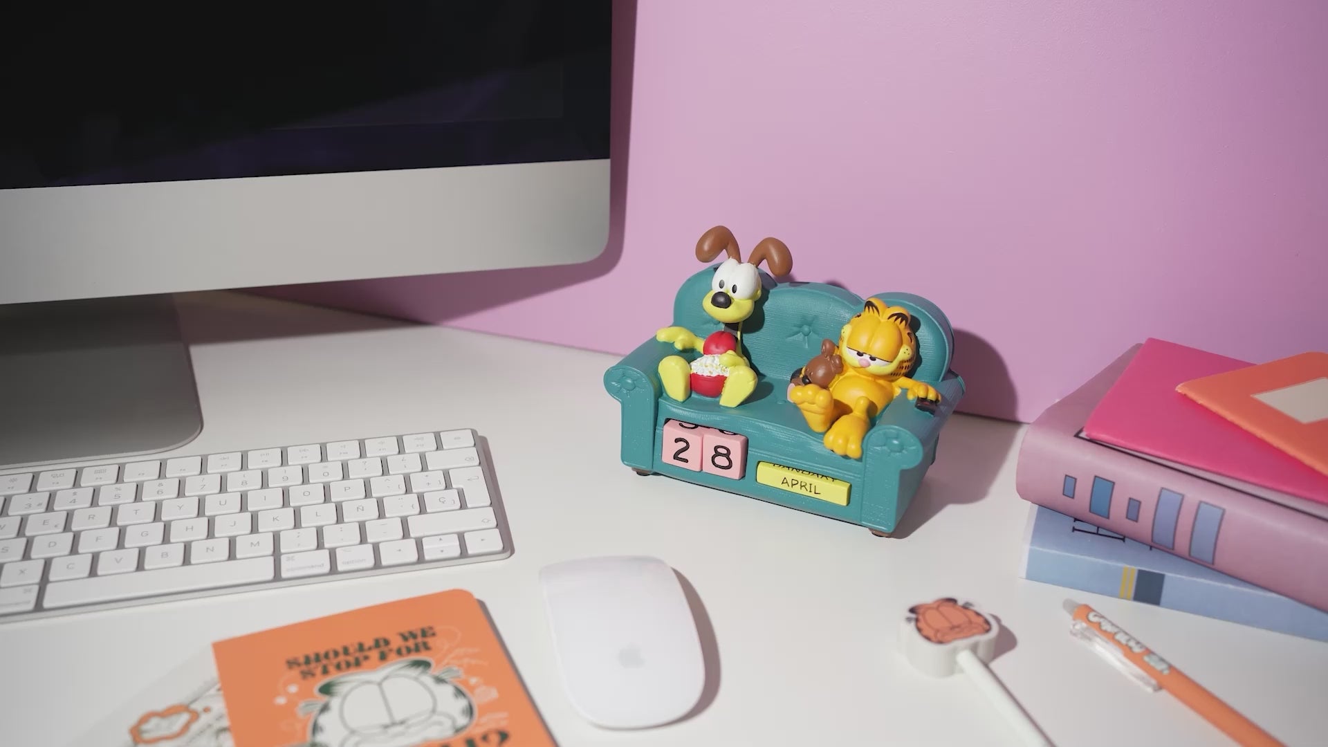Este calendario perpetuo de Garfield tiene un diseño en 3D que muestra a Garfield relajado en el sofá junto a su osito Pooky, mientras Odie disfruta de unas palomitas.