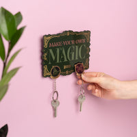 Este colgador de llaves de Wicked cuenta con un elegante diseño en tonos verdes y dorados con la frase Make Your Own Magic. Incluye dos llaveros de Elphaba y Glinda, las dos brujas más icónicas de Oz.