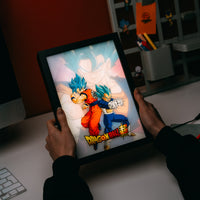 Esta lámina decorativa enmarcada de Dragon Ball muestra a Goku y Vegeta en su transformación Super Saiyan Blue. Al encender las luces LED del interior, reproduce una imagen de fondo que complementa a la imagen principal, transformando por completo la escena.