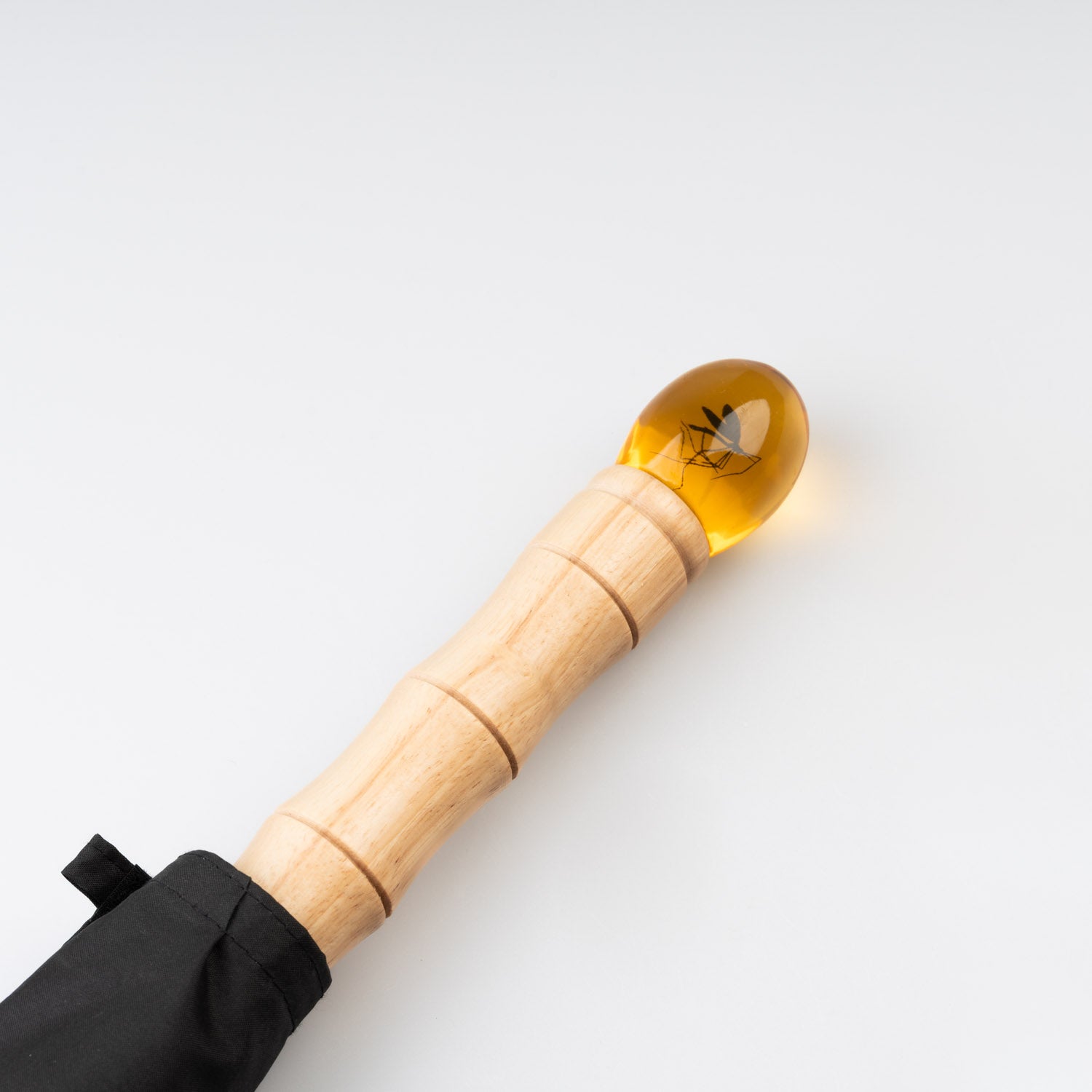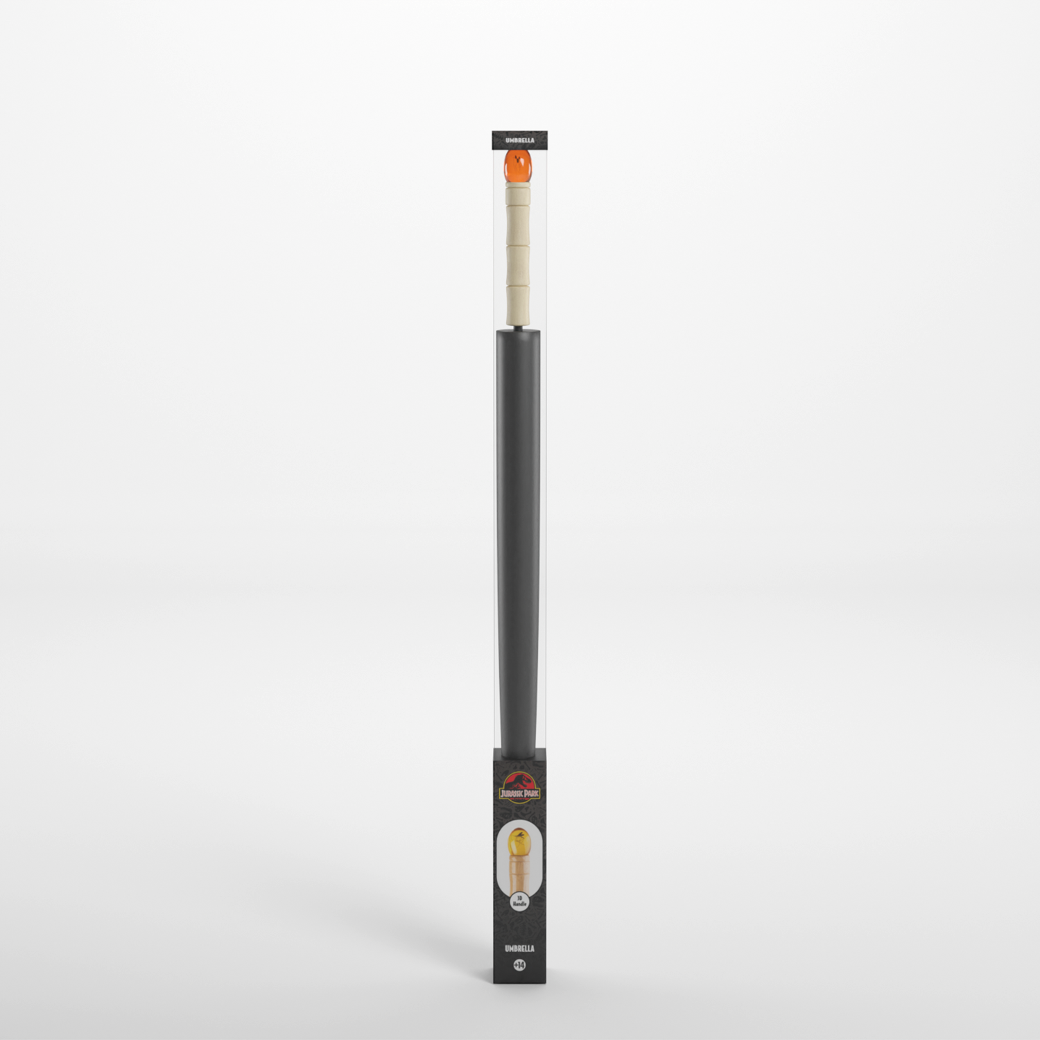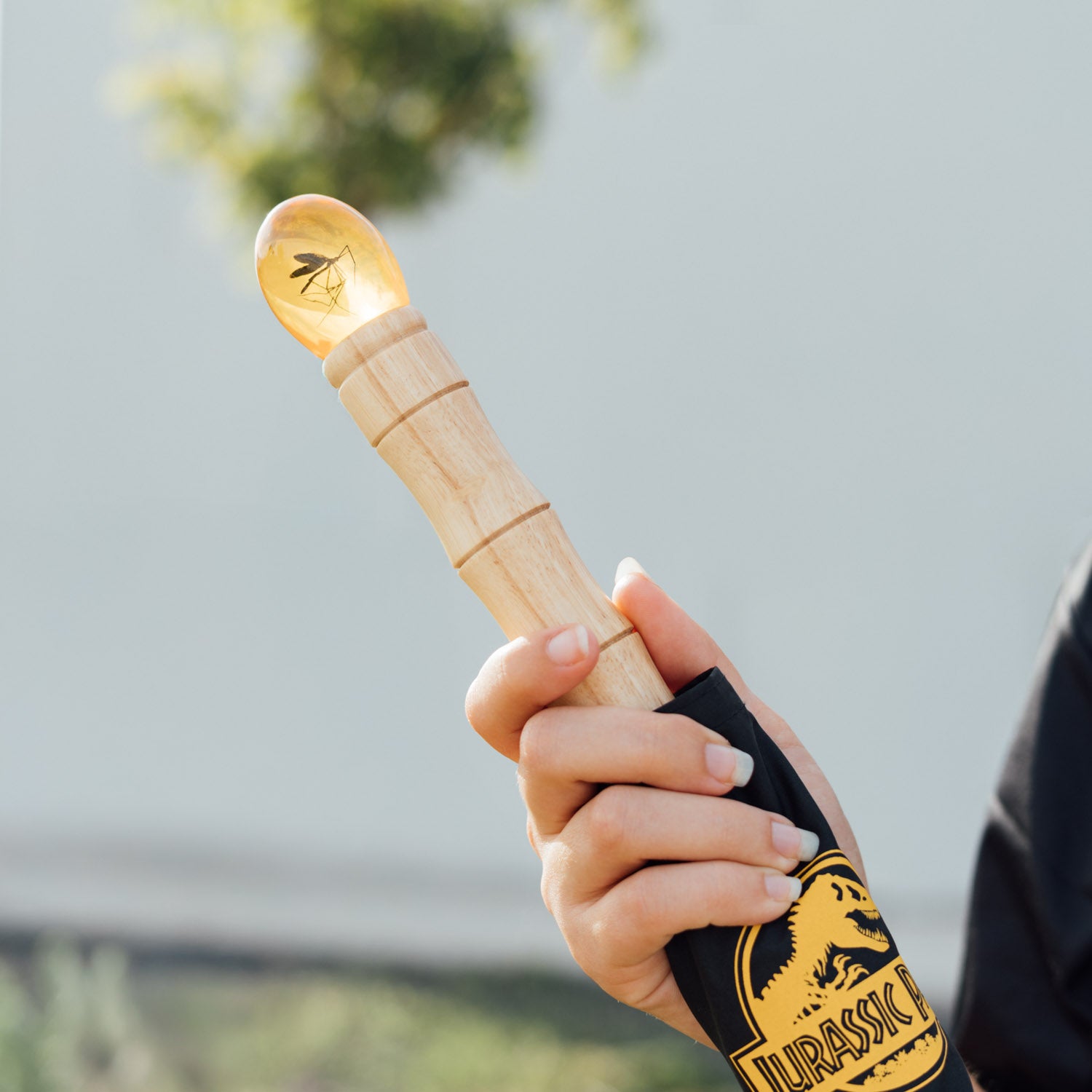 El mango está hecho en madera de caucho y lleva incorporado en su extremo un elemento decorativo de resina que contiene un mosquito, inspirado en el bastón de John Hammond que aparece en la película.