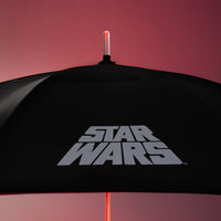Este paraguas de Star Wars está inspirado en el sable láser de Darth Vader e incluye un modo de iluminación fija de color rojo con un único botón de control situado en el mango del paraguas. Funciona con 3 pilas AAA 1.5V (no incluidas).